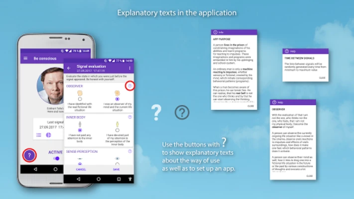 The mind is always trying to drag us into solving fictional situations in the future or experiences from the past. The signals generated by the app and the need of their consecutive evaluation make the person return from their constructions of thoughts to the present moment and live their life as consciously and in the present as possible.