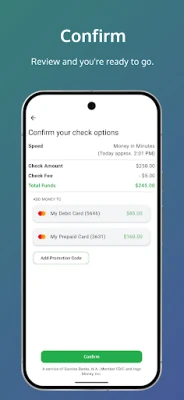 Ingo Money is a service provided by Sunrise Banks, N.A. Member FDIC and Ingo Money, Inc., subject to the Sunrise Banks and Ingo Money Terms and Conditions and Privacy Policy. Approval usually takes 3 to 5 minutes but can take up to one hour. All checks are subject to approval for funding in Ingo Money’s sole discretion. Fees apply for approved Money in Minutes transactions funded to your card or account. Unapproved checks will not be funded to your card or account. Ingo Money reserves the right to recover losses resulting from illegal or fraudulent use of the Ingo Money Service. Your wireless carrier may charge a fee for data usage. Additional transaction fees, costs, terms and conditions may be associated with the funding and use of your card or account. See your Cardholder or Account Agreement for details. Ingo Money service is not available for use within the state of New York.